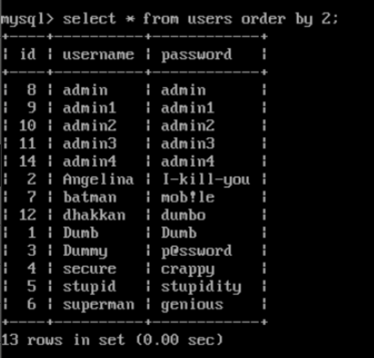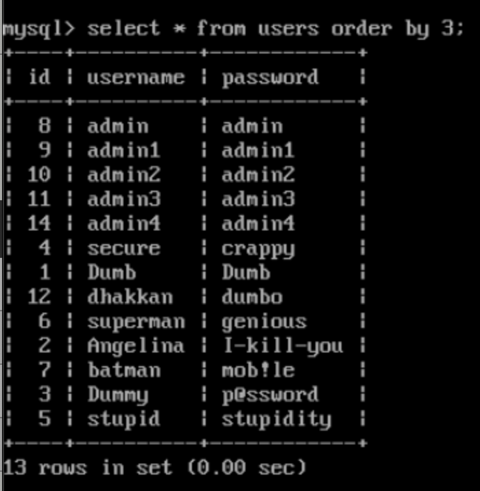 - 三个查询分别以id,username,password三个字段正序排列,当查到4的时候发现没有第四个字段