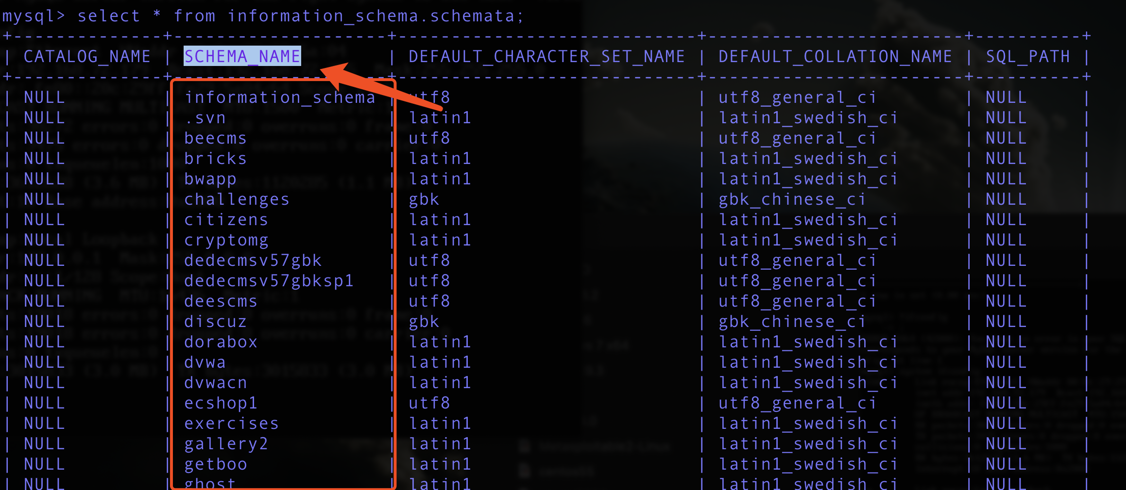 - 可以看到id,username 分别被1,2站位站掉了,而password读取的内容则为information_schema这个数据库下面的schemata这张表里面的schema_name 这个字段,schema_name这个字段里面存储着mysql中所有的数据库。