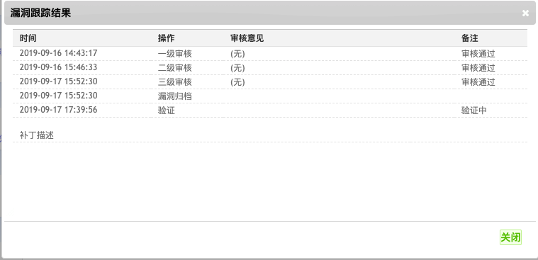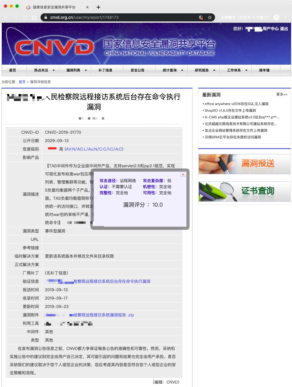 归档编号 CNVD-2019-31770记录一下漏洞归档时间线 一级审核 (2019-09-16 14:43:17) 审核通过 二级审核 (2019-09-16 15:46:33) 审核通过 三级审核 (2019-09-17 15:52:30) 审核通过 基本上三天内就过了审核 审核过完之后能看到自己漏洞的评分 (评分规则按照CVSS 2.0标准评判) 之后漏洞归档 (2019-09-17 15:52:30) 归档完毕后会漏洞验证(2019-09-17 17:39:56) 【这里需要的时间长一点 目测需要几周时间】 最后透露一下(预计下一篇文章放出批量次漏洞的POC哦~)